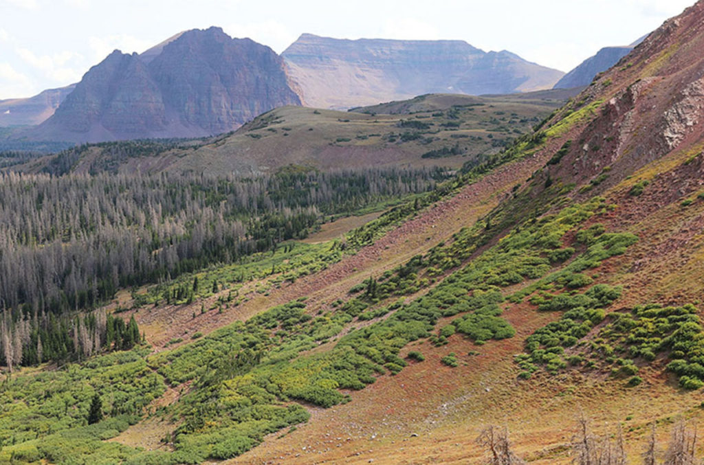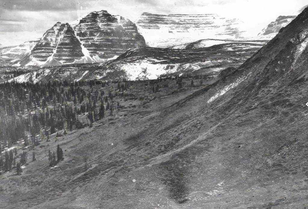 Image 1, 2: Confronti fotografici, come questi scatti del Red Castle Mountain nello Utah, scattati nel 1870 e nel 2024, aiutano a verificare le immagini satellitari dell’avanzare dei limiti degli alberi.