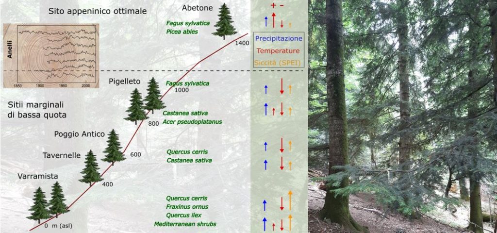 immediati, sia nel lungo termine (pluriennale), attraverso un effetto cumulativo delle condizioni climatiche pregresse, come il susseguirsi di annate siccitose o di eventi piovosi che incidono sulla disponibilità idrica del suolo anche in profondità. In ambiente mediterraneo, questo risultato è emerso anche per altre specie arboree, evidenziando il ruolo significativo delle condizioni climatiche pregresse come fattore limitante la crescita. Al contrario, l’abete bianco nel sito appenninico più fresco e umido risente meno della siccità e degli effetti climatici degli anni passati.